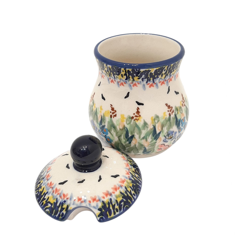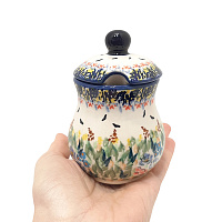 Маленкая баночка с крышкой. На крышке удобная выемка для ложки. Баночка подойдет для горчицы, джема и др. Милая вещица, украсит кухонный интерьер.