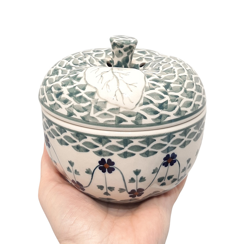 Небольшой контейнер в виде яблока, который можно ставить в духовку и использовать для запекания - в крышке есть отверстие для выхода пара. Можно использовать для хранения сыпучих продуктов и в качестве сахарницы или конфетницы.