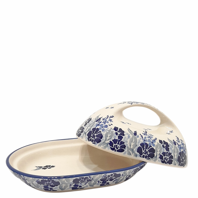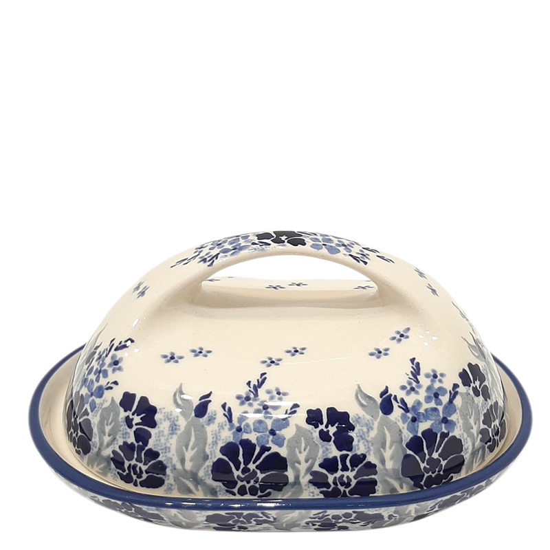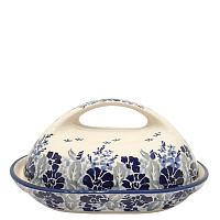У этой масленки очень удобная ручка, а нижняя часть, выполнена в виде тарелочки. В масленку помещается стандартный брикет масла. Керамическая посуда обладает свойствами термоса, удерживая нужную температуру, и за счет этих свойств масленка прекрасно сохраняет сливочное масло и без холодильника.